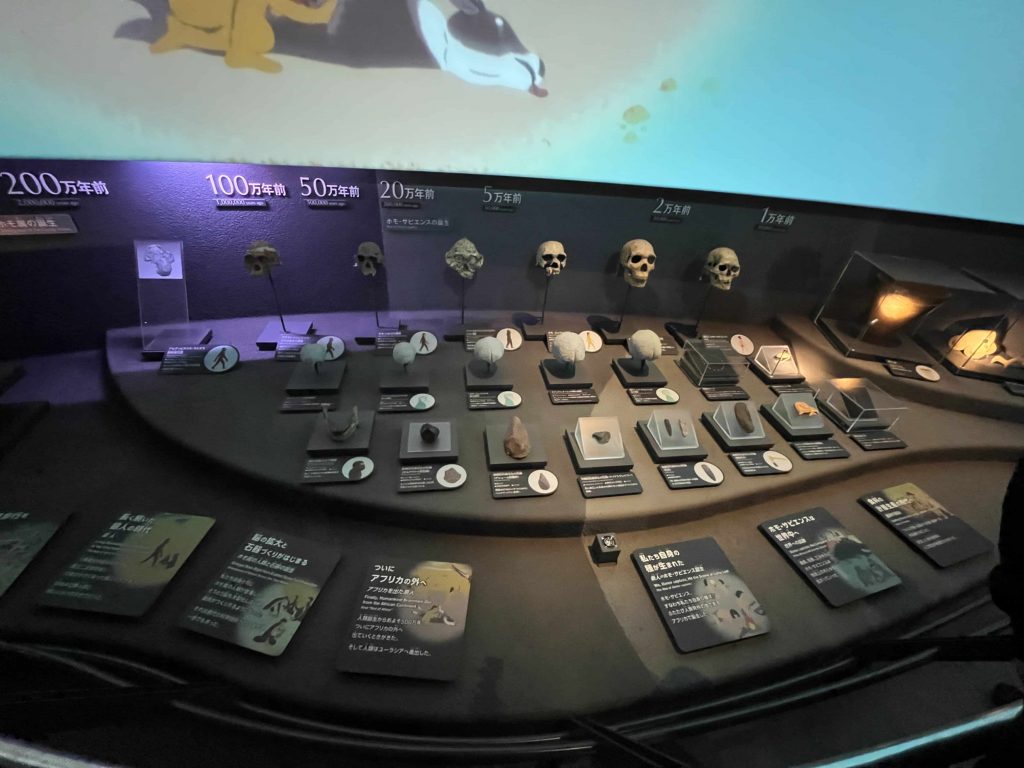 最初のフロアでは、人類の進化と文化についても学びました。200万年前から現代までの人類の頭骨や、石器、そして土器が並ぶ展示は、生命の進化の歴史が、そのまま私たちの文化や生活に繋がっていることを知りました